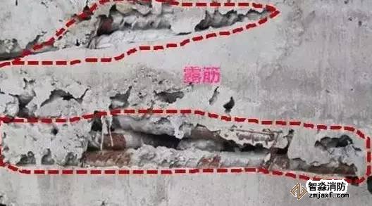 露筋即鋼筋沒有被混凝土包裹而外露。主要是由于未放墊塊或墊塊位移、鋼筋位移、結(jié)構(gòu)斷面較小、鋼筋過密等使鋼筋緊貼模板,以致混凝土保護(hù)層厚度不夠所造成的。有時(shí)也因缺邊、掉角而露筋。