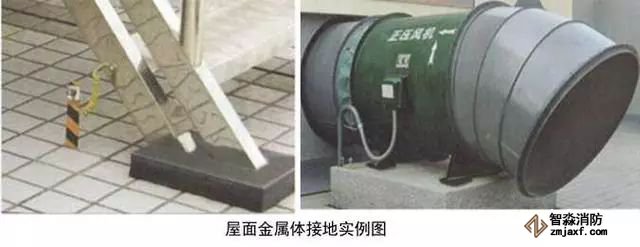 6、屋面金屬體接地:用-25x4的鍍鋅扁鋼從就近的避雷網(wǎng)引接地線(xiàn),接地扁鋼一端與避雷網(wǎng)連接,另一端在金屬體附近地面引出,應(yīng)高于設(shè)備基礎(chǔ)100~200mm。無(wú)振動(dòng)設(shè)備在金屬體上直接焊接,有震動(dòng)設(shè)備和非碳鋼金屬體應(yīng)用編織軟銅線(xiàn)兩端壓端子跨接,編織軟銅線(xiàn)外套黃綠雙色熱縮套且熱縮。伸出地面的接地母線(xiàn)應(yīng)刷黃綠相間油漆。體積較大的金屬體應(yīng)做不小于2處的接地,高度高于避雷網(wǎng)時(shí),應(yīng)加避雷針保護(hù)。接地母線(xiàn)附近應(yīng)做接地標(biāo)識(shí)。