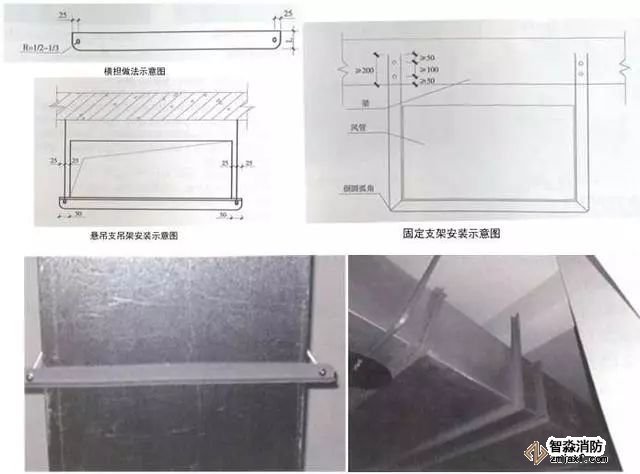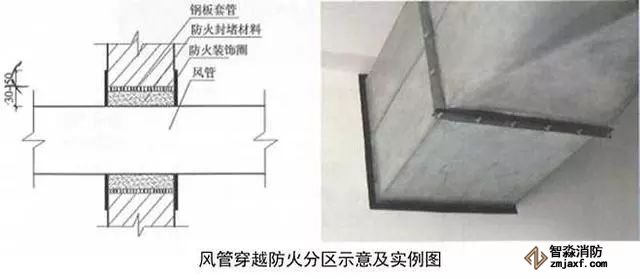 2、風(fēng)管穿越防火分區(qū)做法:用2mm厚鋼板加工制作風(fēng)管套管,套管接縫應(yīng)滿(mǎn)焊,套管尺寸比風(fēng)管四周尺寸大30~50mm,套管長(zhǎng)度與墻面厚度一致。安裝完后用防火材料將套管與風(fēng)管間隙填塞密實(shí)。用2mm厚、30~50mm寬黑色橡膠裝飾圈收口,裝飾圈角部45°拼接。風(fēng)管穿越防火分區(qū)處必須設(shè)防火閥,防火閥距墻分隔墻間距不大于200mm,風(fēng)管長(zhǎng)邊大于630mm時(shí),宜在防火閥兩側(cè)設(shè)單支吊架。