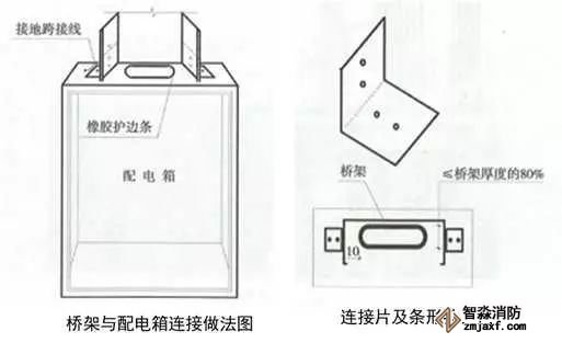 3、橋架與配電箱的連接:配電箱頂部劃線(xiàn)、鉆孔,用電鋸開(kāi)條形孔,清理孔邊沿毛刺,孔兩端為弧形,兩端尺寸小于橋架寬度10mm左右,厚度小于等于橋架厚度的80%,孔中心與橋架中心對(duì)應(yīng),開(kāi)孔處補(bǔ)漆,孔周邊粘貼橡膠條護(hù)口。箱體與橋架用1~1.5mm厚、90°的橋架連接片連接,連接螺栓絲頭朝外,加設(shè)專(zhuān)用墊片,刃面朝向橋架連接片,螺栓外露2~3扣絲。橋架與箱體采用4mm²黃綠雙色多股軟銅線(xiàn)或編織軟銅線(xiàn)接地跨接。