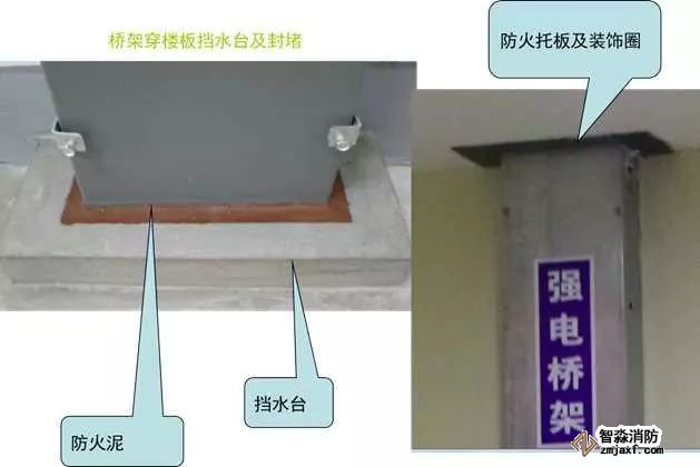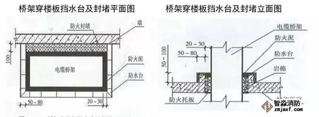 5)電井應(yīng)設(shè)門(mén)檻,橋架、插接母線(xiàn)在地面或穿樓板處有不低于50mm的擋水臺(tái),橋架、插接母線(xiàn)穿樓板處應(yīng)做20~30mm防火封堵,頂部設(shè)置防火托板,加裝飾圈。
