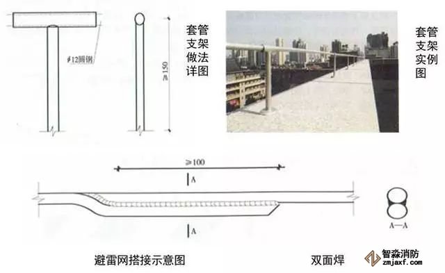 5、屋面金屬通氣管接地:采用鍍鋅扁鋼自屋面避雷網(wǎng)從透氣管根部引出,用抱箍沿透氣管固定,距根部或裝飾臺(tái)面間距300mm,根部與接地線(xiàn)連接,搭接長(zhǎng)度不小于100mm,透氣管的連接部位做接地跨接。