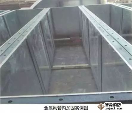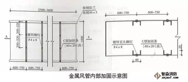 大口徑(b≥2500mm)鍍鋅鋼板風(fēng)管加固:利用1.2mm厚的鍍鋅鋼板制作C形條,沿風(fēng)管寬度方向?qū)形條按600~750mm間距鉚接。鉚釘按200~220mm間距鉚接在風(fēng)管內(nèi)側(cè)。加固完成后安裝風(fēng)管兩側(cè)法蘭。