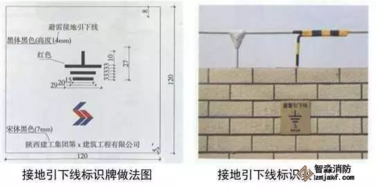 4、引下線(xiàn)標(biāo)識(shí):用厚度等于1mm的不銹鋼板加工制作標(biāo)識(shí)牌,具體要求見(jiàn)圖;用黃、綠油漆對(duì)引下線(xiàn)進(jìn)行相間標(biāo)識(shí),黃綠漆相間30~40mm;在引下線(xiàn)正下方距女兒墻頂面150mm處用云石膠粘貼標(biāo)識(shí)牌,位置明顯,便于觀察。