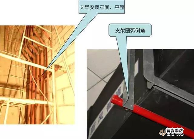 質(zhì)量控制要點(diǎn):支架安裝牢固,成排支架應(yīng)排列成線(xiàn)、標(biāo)高一致。
