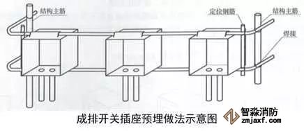 2、成排開(kāi)關(guān)插座盒安裝:根據(jù)結(jié)構(gòu)500mm線(xiàn)和結(jié)構(gòu)墻面線(xiàn),確定成排線(xiàn)盒的高度及位置,墻內(nèi)主筋上做標(biāo)記,上下用兩根鋼筋穿接線(xiàn)盒,兩側(cè)加短鋼筋與結(jié)構(gòu)立筋焊接定位,盒口與模板面平齊,固定端正牢靠,間距均勻。