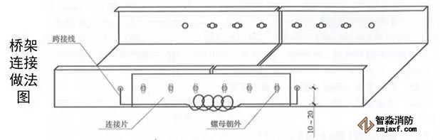 3、橋架進(jìn)出線(xiàn)管:根據(jù)出線(xiàn)口位置,在橋架側(cè)面開(kāi)孔,一管一孔。管端套5~6扣絲,與橋架連接內(nèi)外側(cè)采用鎖母固定,管口伸入橋架內(nèi)不大于5mm,導(dǎo)管與橋架采用不小于4mm²的軟銅線(xiàn)接地跨接。