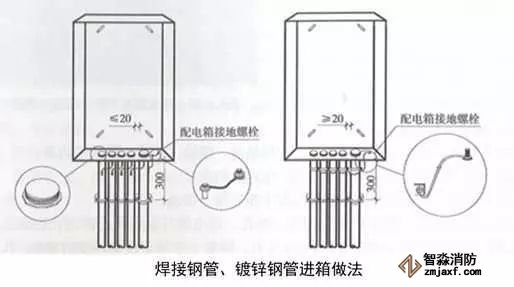 2、明配管進(jìn)箱處理:對(duì)于明配導(dǎo)管,距配電箱300處進(jìn)行固定;箱體采用開(kāi)孔器開(kāi)孔,孔徑與管徑相一致,開(kāi)孔間距均勻,邊沿間距不小于20mm;進(jìn)入箱體的導(dǎo)管端部套絲,采用鎖母固定,外露2~3扣絲;箱體與導(dǎo)管之間、箱體與裝設(shè)電氣部件的門(mén)之間采用編織軟銅線(xiàn)進(jìn)行接地連接,編織軟銅線(xiàn)兩端壓接接線(xiàn)端子。