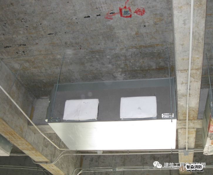 為防止軸流風機工作時擺動,用槽鋼做成框架固定在樓板上,圖為排風兼排煙風機下部設置阻尼彈簧減震器