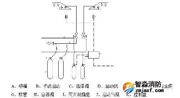 本系統(tǒng)的主要設(shè)備和器材包括:?jiǎn)?dòng)氣瓶、啟動(dòng)氣瓶、滅火劑瓶組、控制器、選擇閥、安全閥、容器閥、噴嘴等。