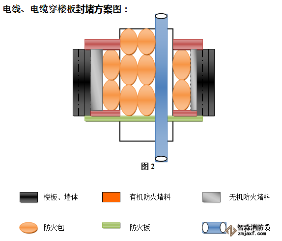 具體做法為:對(duì)預(yù)留孔平整、規(guī)整的洞口可采用以膨脹螺絲固定于洞口底部,以便于安放防火板,防火板選用5mm的無(wú)機(jī)防火板,在通風(fēng)管道、消防管、水管、電纜、橋架周圍用有機(jī)防火堵料和防火包進(jìn)行包裹,確保電纜的載流量不受影響,以便松動(dòng)電纜、橋架、通風(fēng)管、消防管、水管的更換。然后直接灌注無(wú)機(jī)堵料,灌注高度按實(shí)際情況而定。如在通風(fēng)管井、消防管井、水管管井、強(qiáng)電和弱電井道中可按照實(shí)際洞口大小用防火材料在水平地面做高5-10厘米,用于防止意外污水倒流到風(fēng)管、母線或橋架、消防管道、水管管道上造成不必要的損失。
