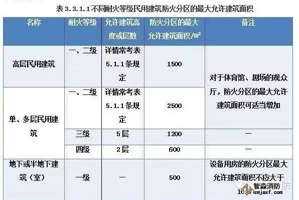 單層、多層民用建筑防火分區(qū)面積是以建筑面積計算的。每個防火分區(qū)的最大允許建筑面積應符合表3.3.1.1的要求。