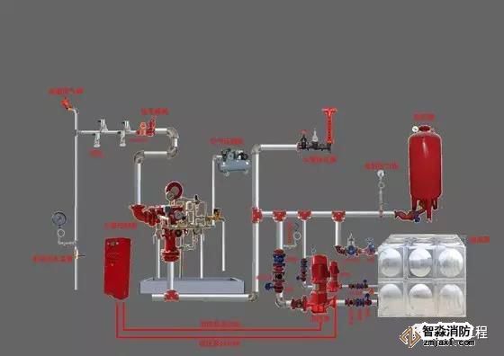 保護(hù)區(qū)域內(nèi)發(fā)生火災(zāi)時(shí),溫度升高使閉式噴頭玻璃球炸裂而使噴頭開(kāi)啟釋放壓力氣體。這時(shí)干式報(bào)警閥系統(tǒng)側(cè)壓力降低,供水壓力大于系統(tǒng)側(cè)壓力(產(chǎn)生壓差),使閥瓣打開(kāi)(干式報(bào)警閥開(kāi)啟),其中一路壓力水流向?yàn)⑺畤婎^,對(duì)保護(hù)區(qū)灑水滅火,水流指示器報(bào)告起火區(qū)域,另一路壓力水通過(guò)延遲器流向水力警鈴,發(fā)出持續(xù)鈴聲報(bào)警,報(bào)警閥組或穩(wěn)壓泵的壓力開(kāi)關(guān)輸出啟動(dòng)供水泵信號(hào),完成系統(tǒng)啟動(dòng)。系統(tǒng)啟動(dòng)后,由供水泵向開(kāi)放的噴頭供水,開(kāi)放噴頭按不低于設(shè)計(jì)規(guī)定的噴水強(qiáng)度均勻噴水,實(shí)施滅火。