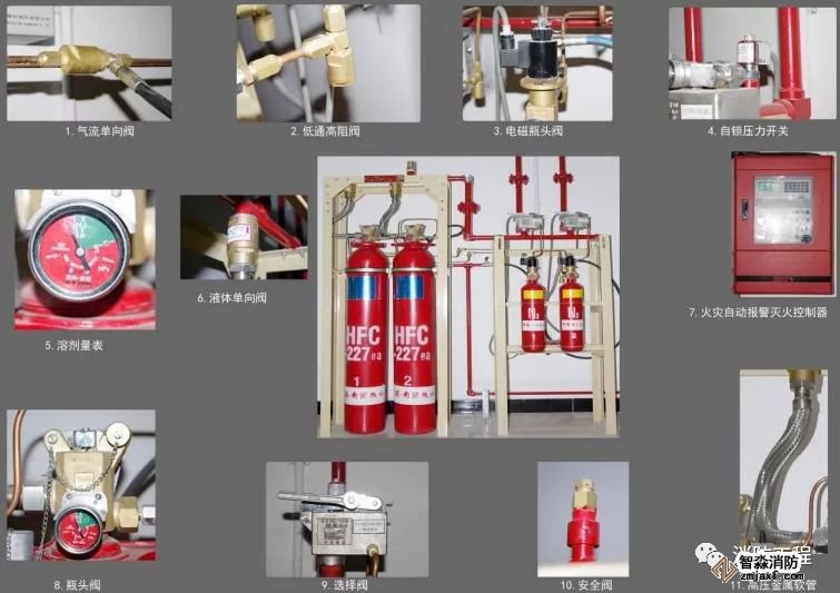 滅火系統(tǒng)主要由自動(dòng)報(bào)警滅火控制系統(tǒng)、滅火劑儲(chǔ)瓶、瓶頭閥、啟動(dòng)氣體儲(chǔ)瓶、電磁瓶頭閥、選擇閥、稱(chēng)重裝置、單向閥、壓力開(kāi)關(guān)、框架、噴嘴、管道等設(shè)備組成。