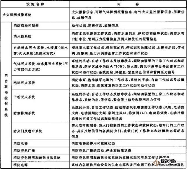 2、消防控制室內(nèi)設(shè)置的消防設(shè)備應(yīng)能監(jiān)控并顯示建筑消防設(shè)施運(yùn)行狀態(tài)信息,并應(yīng)具有向城市消防遠(yuǎn)程監(jiān)控中心(以下簡(jiǎn)稱監(jiān)控中心)傳輸這些信息的功能。建筑消防設(shè)施運(yùn)行狀態(tài)信息見(jiàn)下表1。
