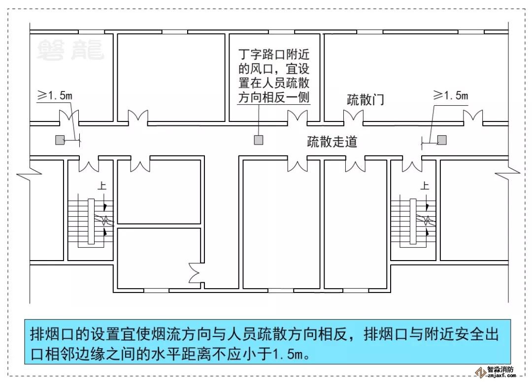 對(duì)于T字形或回形疏散走道,必須輔以正確的疏散指示標(biāo)志和應(yīng)急照明系統(tǒng),對(duì)于設(shè)置機(jī)械排煙系統(tǒng)的疏散走道,排煙口的設(shè)置宜使煙流方向與人員疏散方向相反。