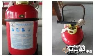 ?、僬_說明滅火器類型(看標示,推車式ABC干粉滅火器,滅A類固體B類液體C類氣體和電類火災)