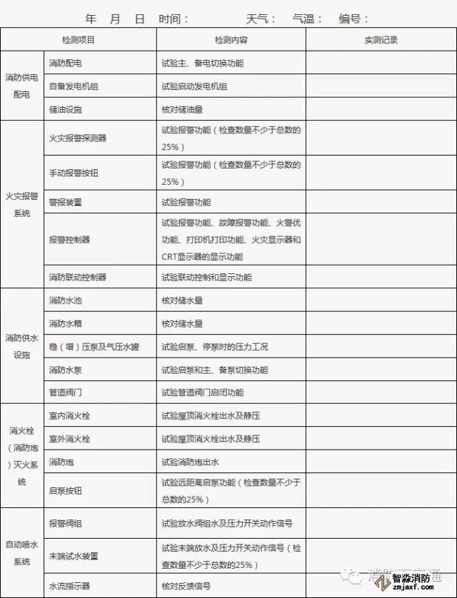 1、建筑消防設(shè)施的單項(xiàng)檢查應(yīng)當(dāng)每月至少一次,并填表。