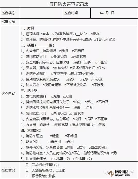 3、對(duì)發(fā)現(xiàn)的問(wèn)題應(yīng)及時(shí)處理,當(dāng)場(chǎng)不能處置的要填報(bào)《建筑消防設(shè)施故障處理記錄》。