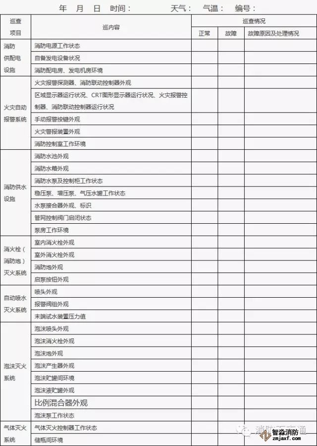 4、附表中各項(xiàng)目情況正常打“√”,存在問(wèn)題或故障的打“×”;對(duì)發(fā)現(xiàn)的問(wèn)題應(yīng)及時(shí)處理,當(dāng)場(chǎng)不能處置的要填報(bào)《建筑消防設(shè)施故障處理記錄》。