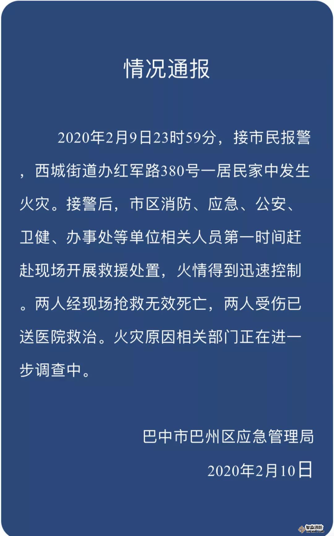 2月9日23時(shí)59分,巴中市巴州區(qū)紅軍路380號(hào)1單元2樓發(fā)生火災(zāi),造成2人死亡,2人受傷。