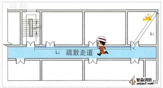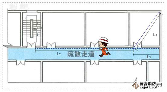 疏散走道是用于人員疏散通行至安全出口或相鄰防火分區(qū)的走道,疏散走道的兩側(cè)隔墻和樓板應(yīng)滿足相應(yīng)建筑耐火等級(jí)的燃燒性能和耐火極限要求,疏散走道不能有可燃物,也不能作為工作或作業(yè)場所。因此,通常情況下,疏散走道不會(huì)是火災(zāi)發(fā)生部位,人員也不會(huì)在走道過多逗留。另一方面,疏散走道兩側(cè)房間內(nèi)的疏散距離,也從側(cè)面限制了疏散走道的長度。