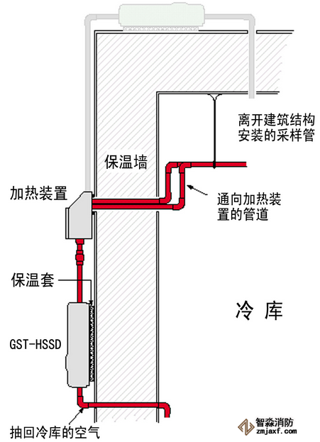冷庫(kù)中采樣管,加熱箱和吸氣式感煙火災(zāi)探測(cè)器的相對(duì)位置
