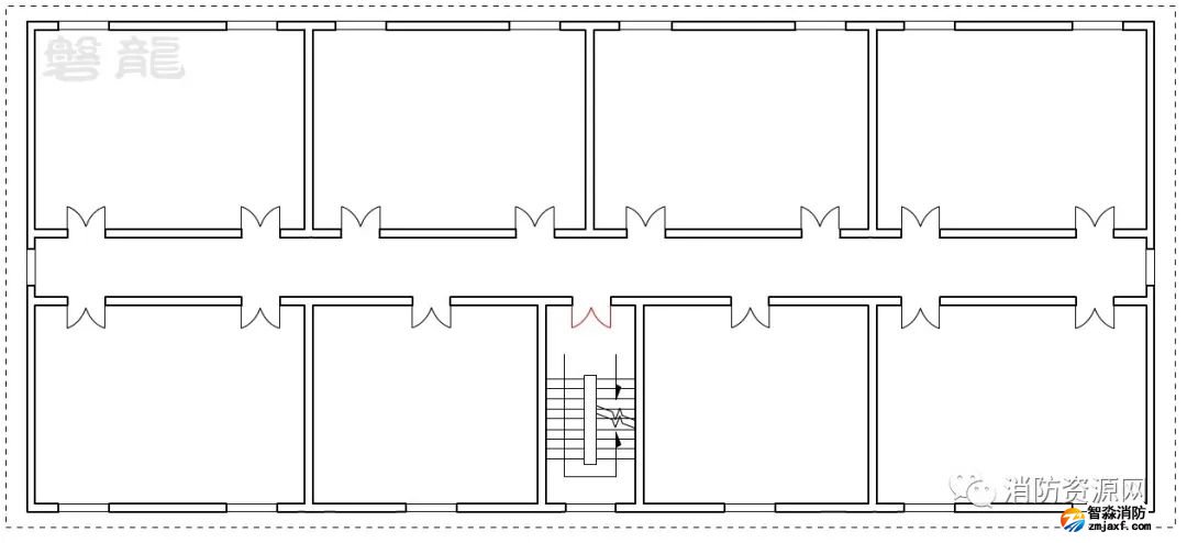 二、圖示2的疏散走道,僅設置有一個疏散樓梯,疏散走道的所有疏散門均為單向疏散,整個疏散走道均應視為單向疏散走道,即袋形走道: