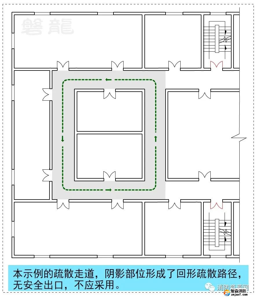 1、圖示9、圖示10所示的疏散走道,示例部位形成環(huán)形疏散路徑,沒有安全出口,不應采用。