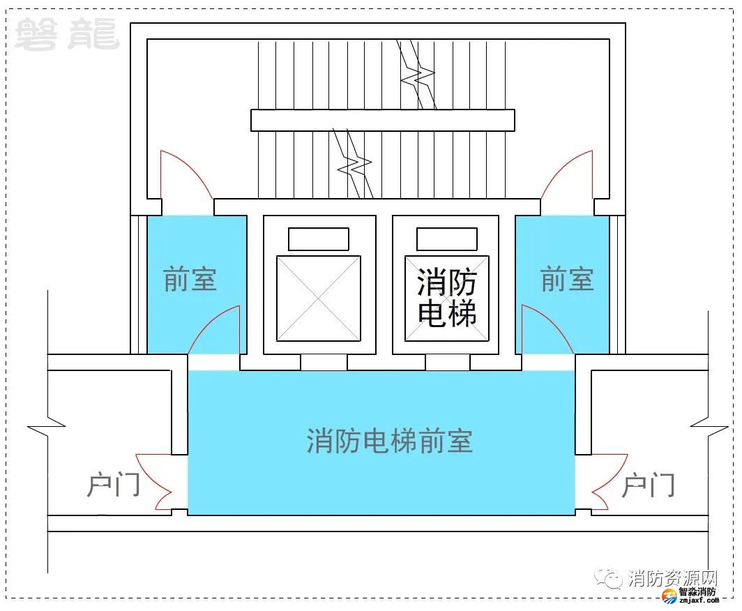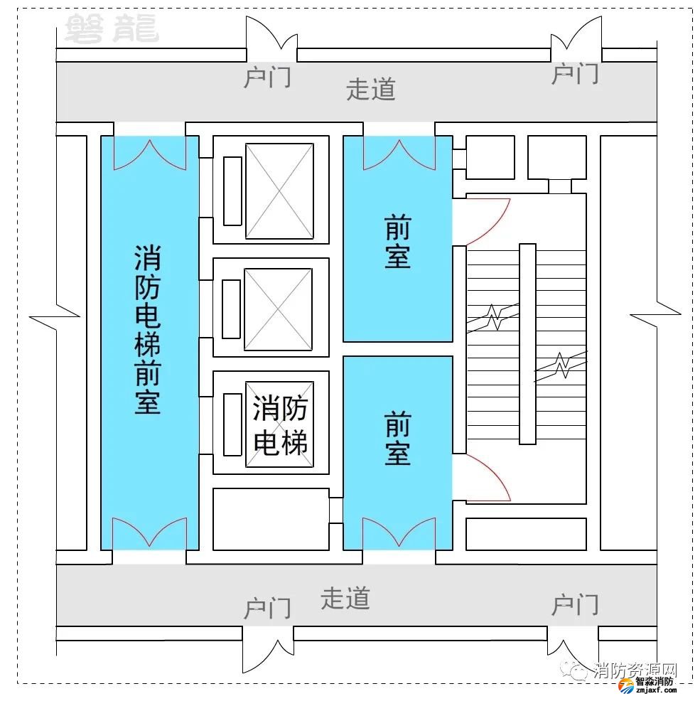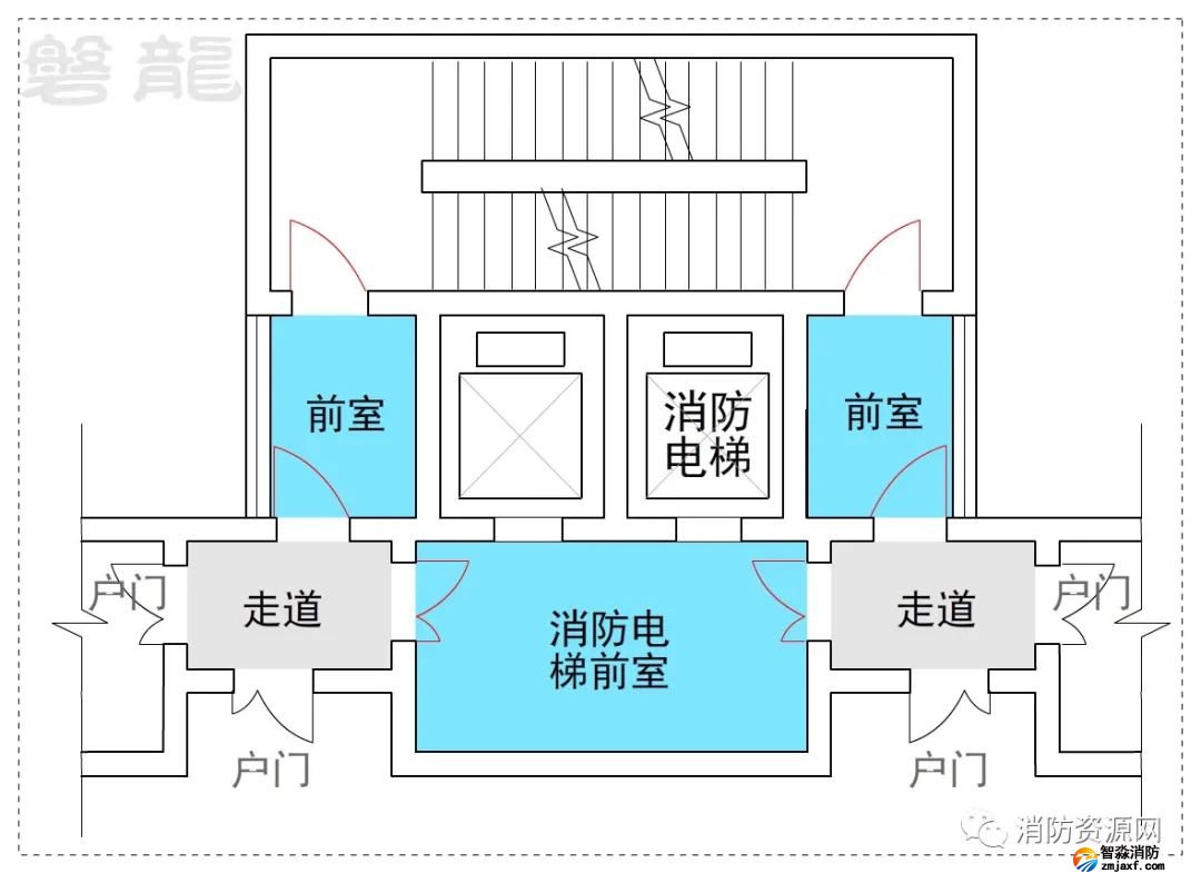 前室應(yīng)該是相對規(guī)則的區(qū)域,特殊情況下,可以有不規(guī)則的擴(kuò)展部分,但應(yīng)確保消防電梯前室規(guī)則區(qū)域的尺寸及面積要求,有疏散功能的通道,其凈寬度應(yīng)計(jì)算確定,并不應(yīng)小于對應(yīng)建筑內(nèi)疏散走道的最小凈寬度要求。