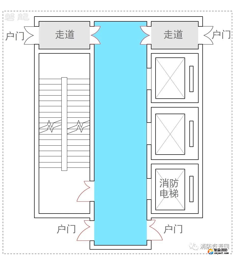 一、住宅建筑人員較少且熟悉現(xiàn)場疏散環(huán)境,因此,在住宅建筑中,為了解決疏散走道雙向疏散的問題,疏散走道通過獨(dú)立的消防電梯前室(不能是合用前室)連通,雖然是一種不合適的方式,但通常被允許(有爭議)。