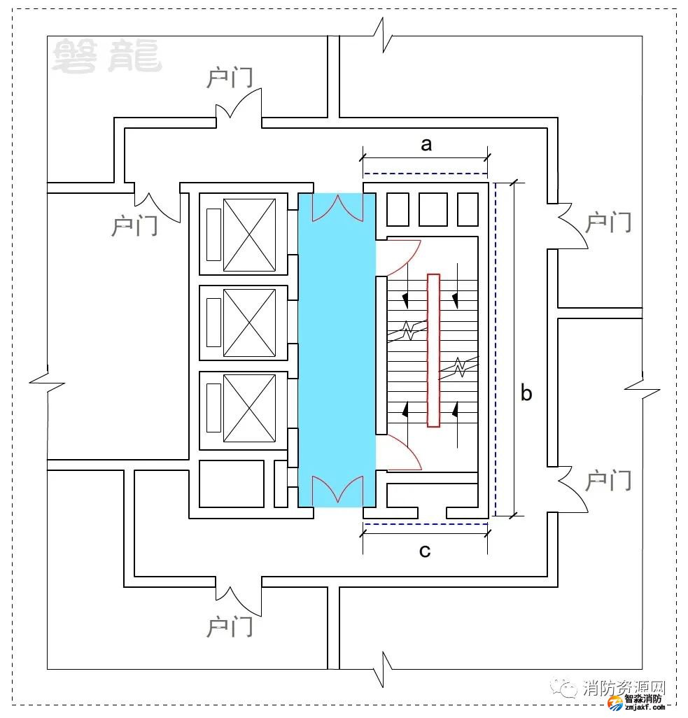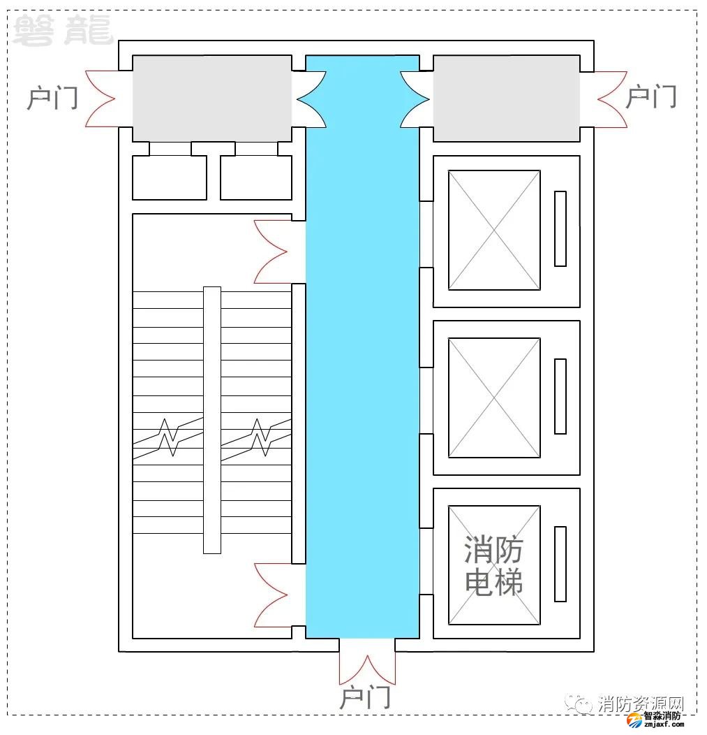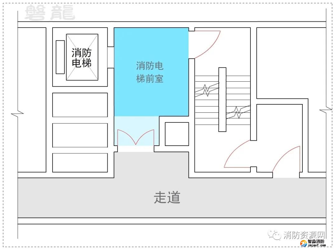 2、許可示例(示例27):本示例中,戶門直接對消防電梯前室開放,也通常認(rèn)為可行:(有爭議)