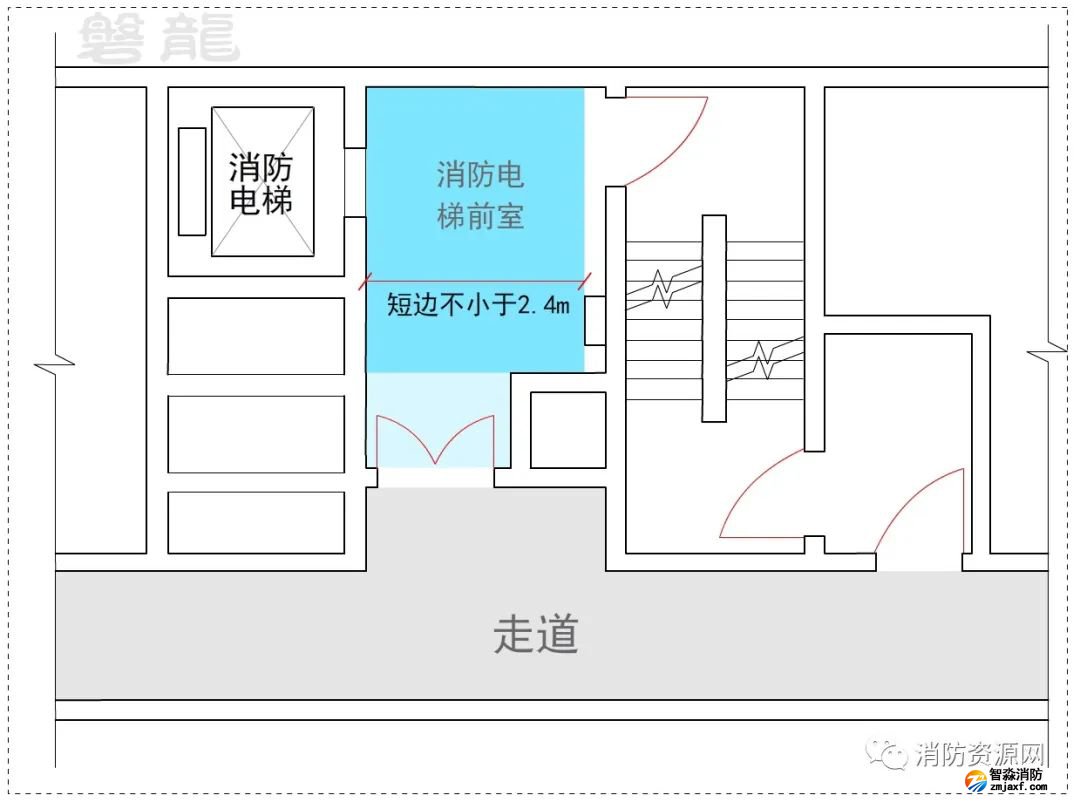 消防電梯前室的短邊不應(yīng)小于2.4m,主要是為了滿足消防員整裝和擔(dān)架運(yùn)輸?shù)裙δ芤?,前室的面積和尺寸應(yīng)是與消防電梯門正對的規(guī)則區(qū)域,不應(yīng)通過過道、拐角等擴(kuò)展區(qū)域來實(shí)現(xiàn)。