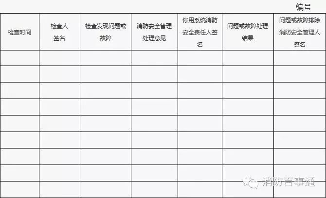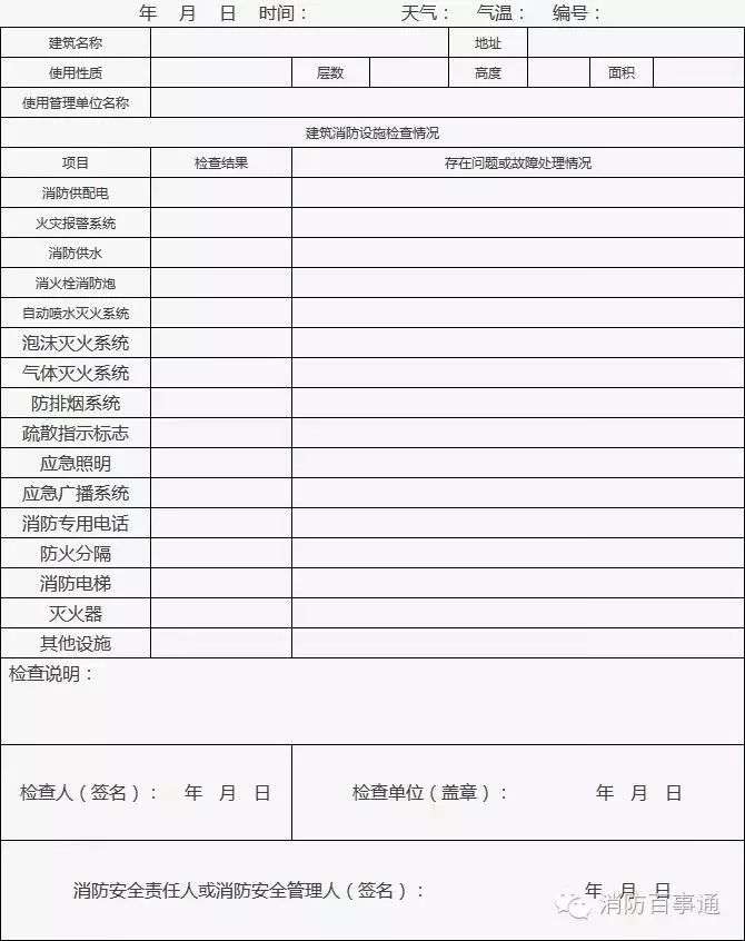 2、發(fā)現(xiàn)的問題或存在故障應(yīng)在“實(shí)測記錄”欄中填寫,并及時(shí)處置;當(dāng)場不能處置的要填報(bào)《建筑消防設(shè)施故障處理登記表》;