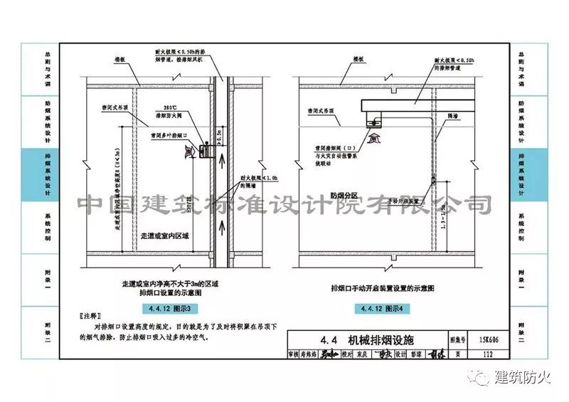 5、第112頁(yè)的“4.4.12圖示3”中側(cè)墻上安裝常閉多葉排煙口前,排煙支管上增加了“280℃排煙防火閥”。