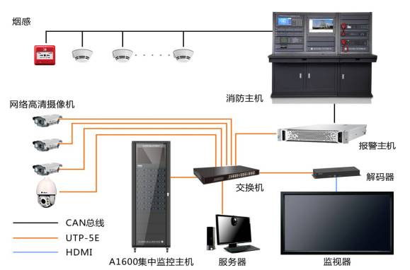本聯(lián)動系統(tǒng)主要由火災(zāi)自動報警系統(tǒng)、報警主機(jī)服務(wù)器、視頻監(jiān)控系統(tǒng)組成。