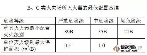 新規(guī)范規(guī)定:B、C類火災(zāi)配置場所的最低配置基準是單具滅火器最小配置滅火級別為: 嚴重危險級為89B, 中危險級為55B, 輕危險級為21B,;