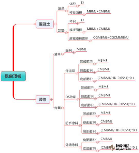 估計很多朋友看不懂“(CMBMJ/HD-0.05*4*0.1”,我解釋下,CMBMJ是飄窗底板側(cè)面模板面積,除以HD(厚度)就是側(cè)面長度,減去0.05*4就是我們要求底板裝修上翻的中心線長度,在乘以0.1就是上翻的面積。