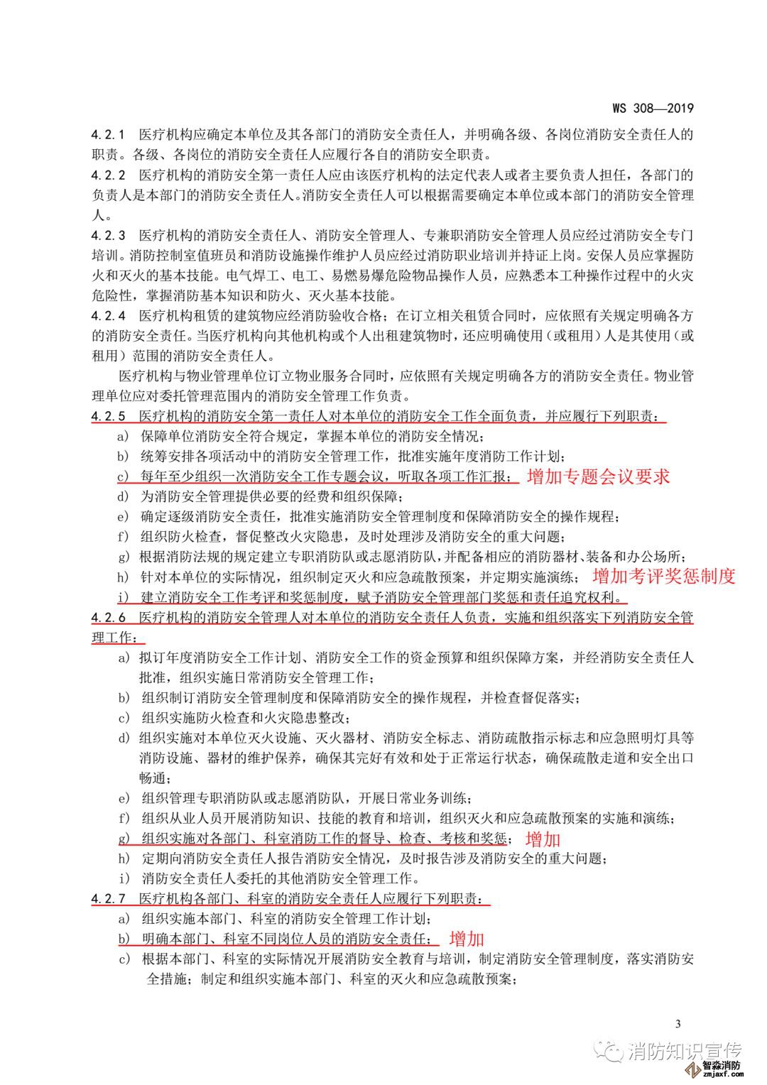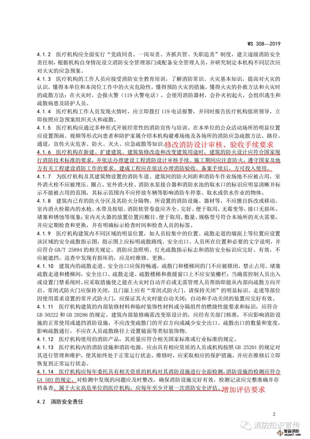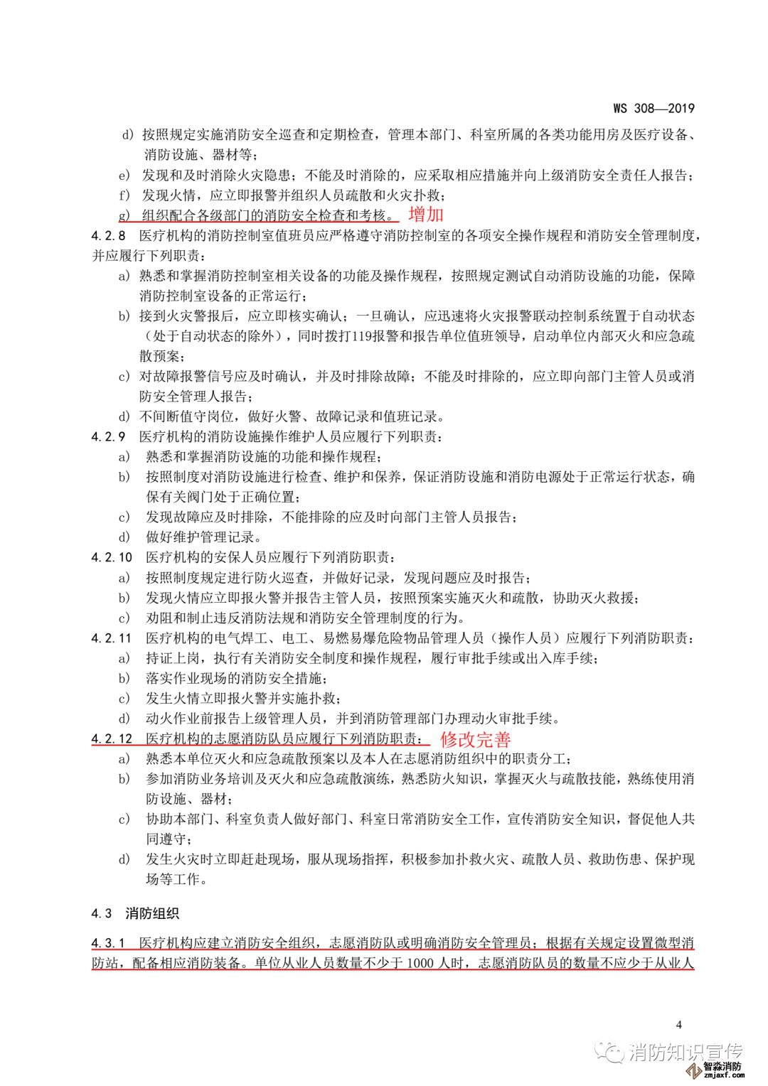 ——修改了各部門、科室的消防安全責(zé)任人的職責(zé)要求(見4.2.7, 2009年版的4.2.6);