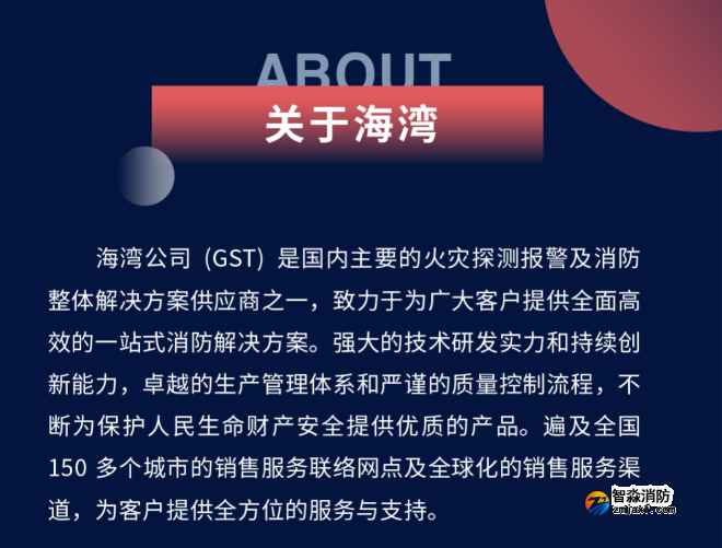 海灣公司(GST)是國(guó)內(nèi)主要的火災(zāi)探測(cè)報(bào)警及消防整體解決方案供應(yīng)商之一,致力于為廣大客戶(hù)提供全面高效的一站式消防解決方案。強(qiáng)大的技術(shù)研發(fā)實(shí)力和持續(xù)創(chuàng)新能力,卓越的生產(chǎn)管理體系和嚴(yán)謹(jǐn)?shù)馁|(zhì)量控制流程,不斷為保護(hù)人民生命財(cái)產(chǎn)安全提供優(yōu)質(zhì)的產(chǎn)品。遍及全國(guó)150 多個(gè)城市的銷(xiāo)售服務(wù)聯(lián)絡(luò)網(wǎng)點(diǎn)及全球化的銷(xiāo)售服務(wù)渠道,為客戶(hù)提供全方位的服務(wù)與支持。