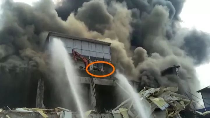 廠房頂部一架挖機(jī)上兩名施工人員被困樓頂,消防人員進(jìn)入火場(chǎng),對(duì)被困人員進(jìn)行施救。