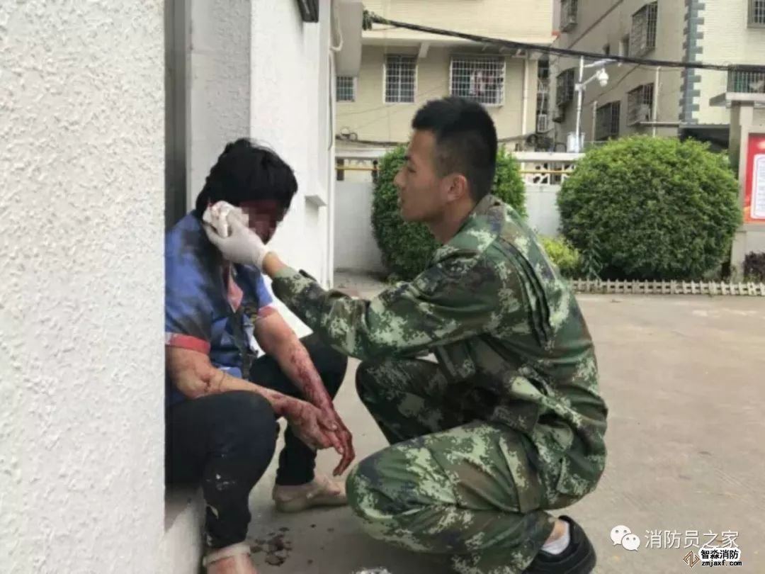 正在午休的消防員聞?dòng)嵖焖仝s到事發(fā)現(xiàn)場,找到了全身鮮血淋漓蜷縮在路邊的保潔阿姨,為她擦拭血跡,并及時(shí)送往醫(yī)院。
