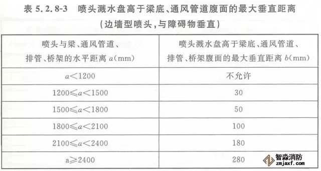 5.2.8 當(dāng)噴頭濺水盤高于附近梁底或高于寬度小于1.2m的通風(fēng)管道、排管、橋架腹面時,噴頭濺水盤高于梁底、通風(fēng)管道、排管、橋架腹面的最大垂直距離應(yīng)符合表5.2.8-1~表5.2.8-9的規(guī)定(見圖5.2.8)。