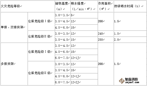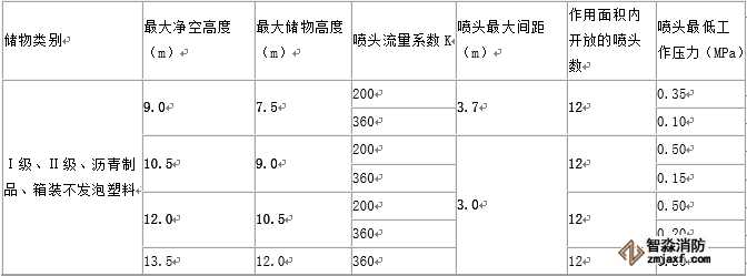 注:1.無包裝的塑料橡膠視同紙袋、塑料袋包裝。 2.貨架內(nèi)置噴頭應采用與頂板下噴頭相同的噴水強度,用水量應按開放6只噴頭確定。 |