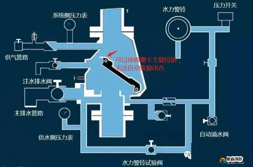 5)試驗(yàn)結(jié)束或者火災(zāi)撲救完之后,系統(tǒng)側(cè)的水全部從主排水管路排出(此時(shí)閥瓣仍是開啟狀態(tài),被復(fù)位銷卡住無法返回)。