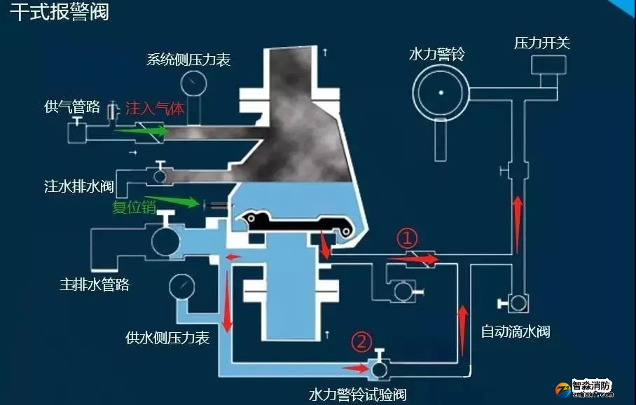 3)圖示中路線①為報(bào)警路線,發(fā)生火災(zāi)后閥瓣開啟,水流進(jìn)入報(bào)警管路(后續(xù)和濕式一致不再重復(fù))。這里關(guān)鍵是當(dāng)閥瓣開啟后由于干式報(bào)警閥閥瓣的前端結(jié)構(gòu),使其可以順時(shí)針通過復(fù)位銷,而無法逆時(shí)針自動(dòng)復(fù)位(會卡在復(fù)位銷位置)。