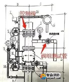 雨淋閥的各管路名稱及作用如圖所示,其中需要注意報(bào)警測試管路以及自動(dòng)滴水閥的位置。雨淋閥組的測試管設(shè)置于閥后,如圖3,閥組開啟后,關(guān)閉閥后控制閥(避免水流進(jìn)入保護(hù)區(qū)),開啟測試管,水會從測試管流出。