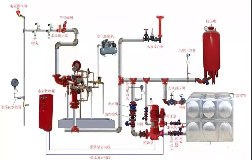 6、 預(yù)作用系統(tǒng)在準(zhǔn)工作狀態(tài)時配水管道內(nèi)不充水,由火災(zāi)自動報警器自動開啟預(yù)作用閥后,轉(zhuǎn)換為濕式系統(tǒng),預(yù)作用系統(tǒng)由閉式噴頭、預(yù)作用閥組、充氣設(shè)備(不是必須有)、水流報警裝置、供水設(shè)施及供水配水管道等組成。