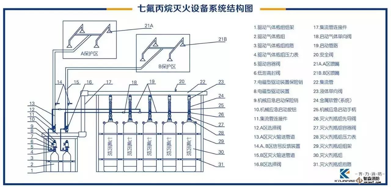 七氟丙烷滅火設備需要設置專用的設備間,用一套或一套以上的貯存裝置保護一個或一個以上的保護區(qū)(總保護區(qū)數(shù)量≤8個,總保護區(qū)體積≤3600m³),使用管網(wǎng)將滅火劑輸送到保護區(qū)的系統(tǒng)。