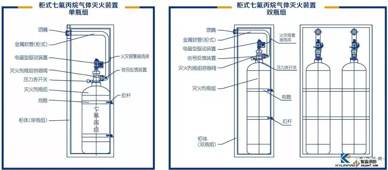 柜式七氟丙烷氣體滅火裝置可以與消防控制中心相連接,由火災報警滅火控制器驅(qū)動實施自動滅火,該裝置不需要設置專用的設備間,整套設備均在保護區(qū)內(nèi)。火災發(fā)生時,本裝置可直接向保護區(qū)內(nèi)自動噴灑藥劑,方便快捷,一個保護區(qū)設立一套系統(tǒng),幾臺裝置連用可以保護較大區(qū)域。